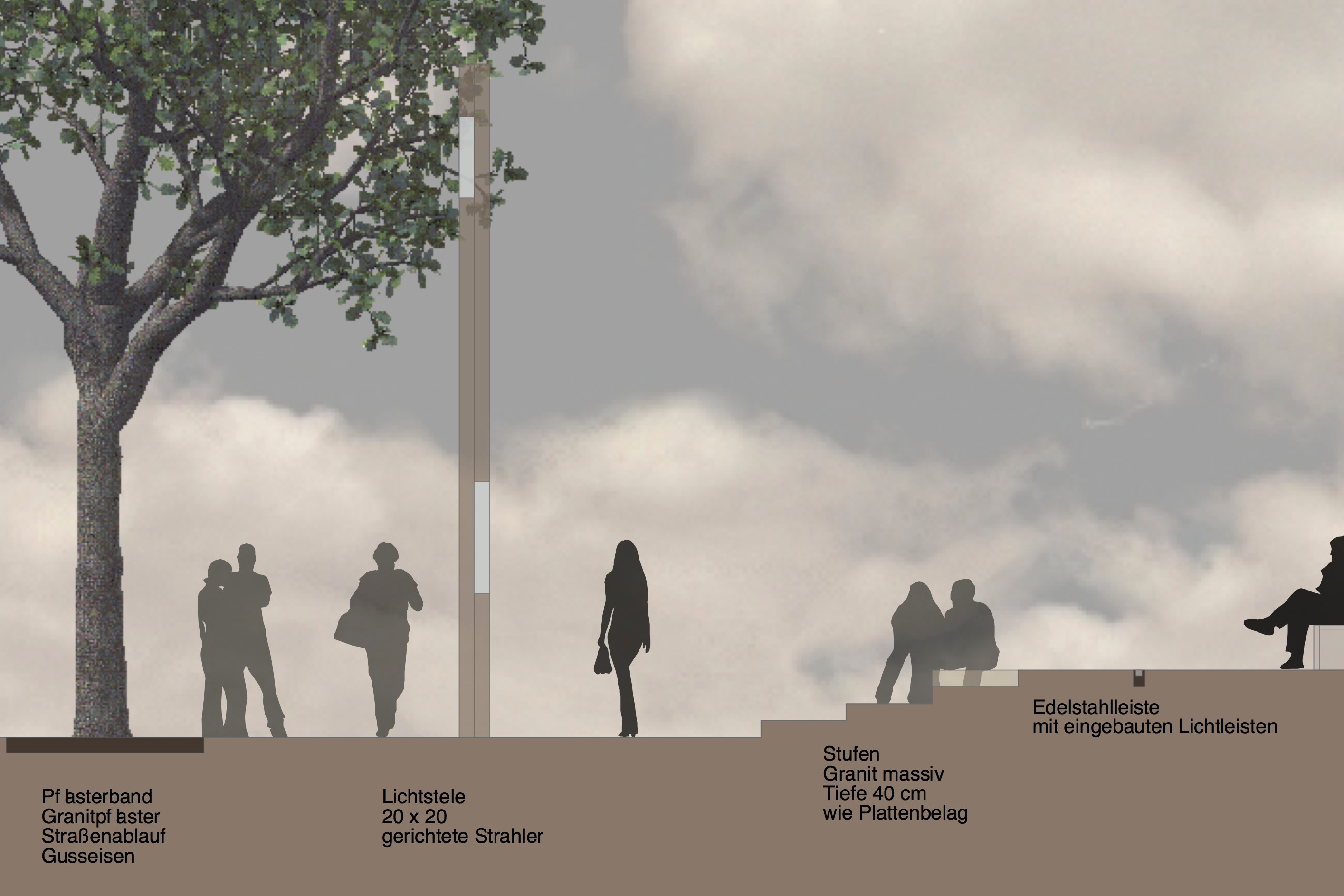 Entlang dieser Raumachse begleitet ein helles Pflasterband, bestückt mit Lichtstelen und einer Reihe von Laubbäumen, den Wegraum vom "Braker Weg" bis zur Lipperlandhalle. Als deutliches Zeichen ist dieses Band auch nachts Wegweiser entlang der Forschungsmeile.