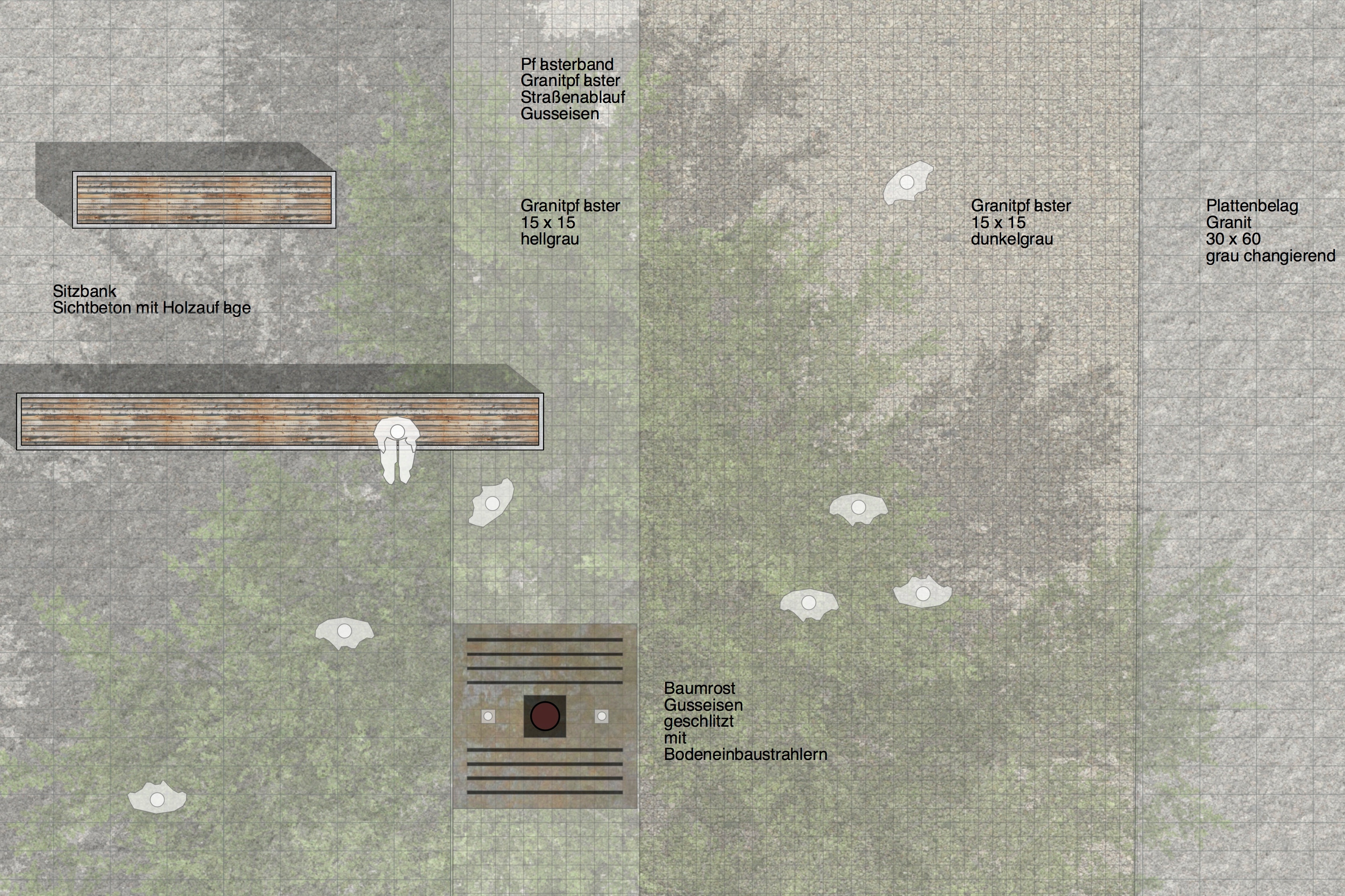 Der Hauptzugang am Braker Weg wird durch eine leicht geneigte, dreieckige Platzfläche gekennzeichnet. Stufen entlang der Wegeverbindungen machen die Platzfläche erlebbar und bieten Sitzgelegenheiten zum Verweilen. Auf der Westseite des Platzes entlang der Raumkante entsteht eine Achse, die den Übergang "Bahnhaltestelle" und den Anschlusspunkt "Johannes-Schuchen-Straße" direkt miteinander verknüpft.