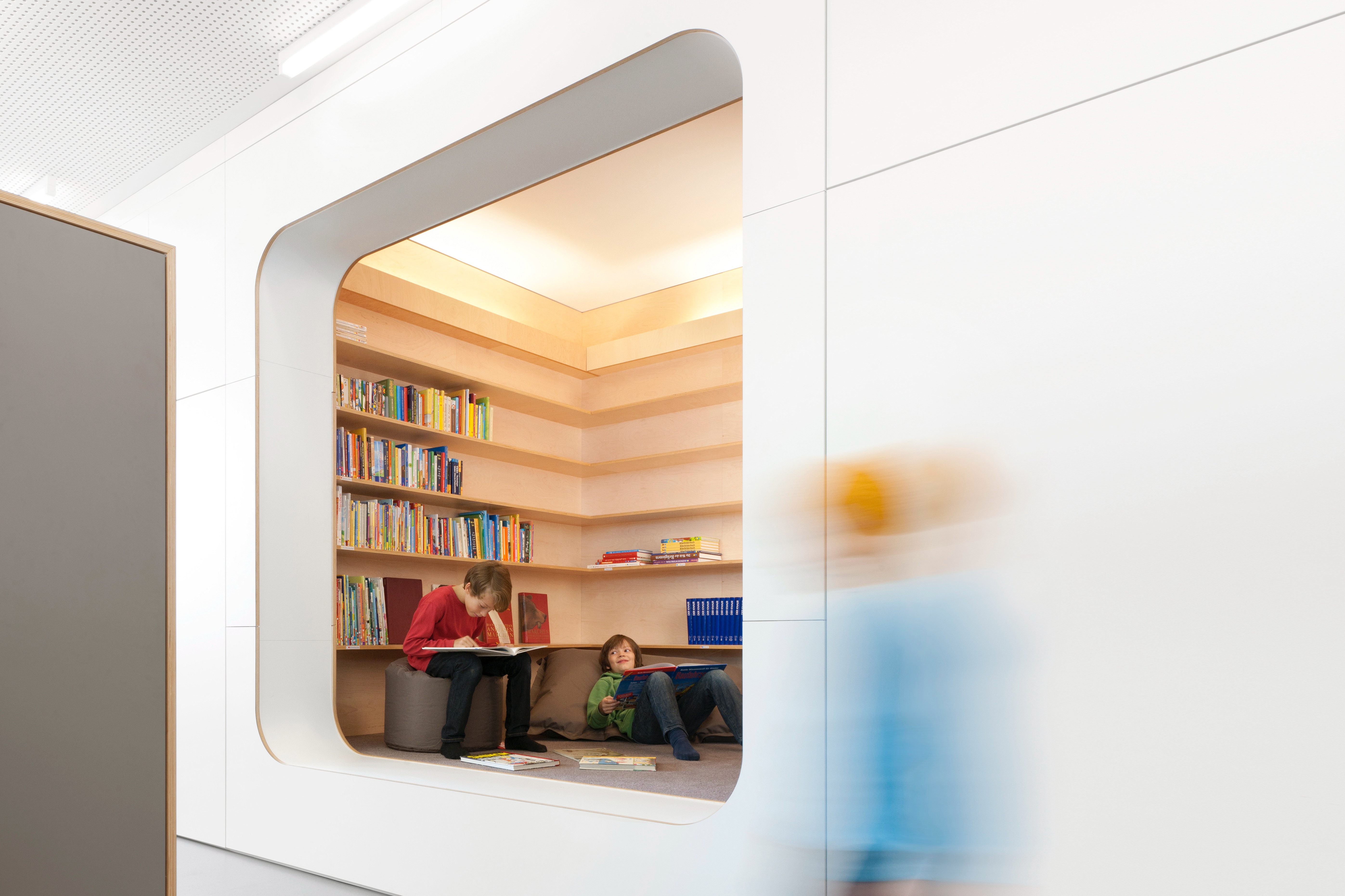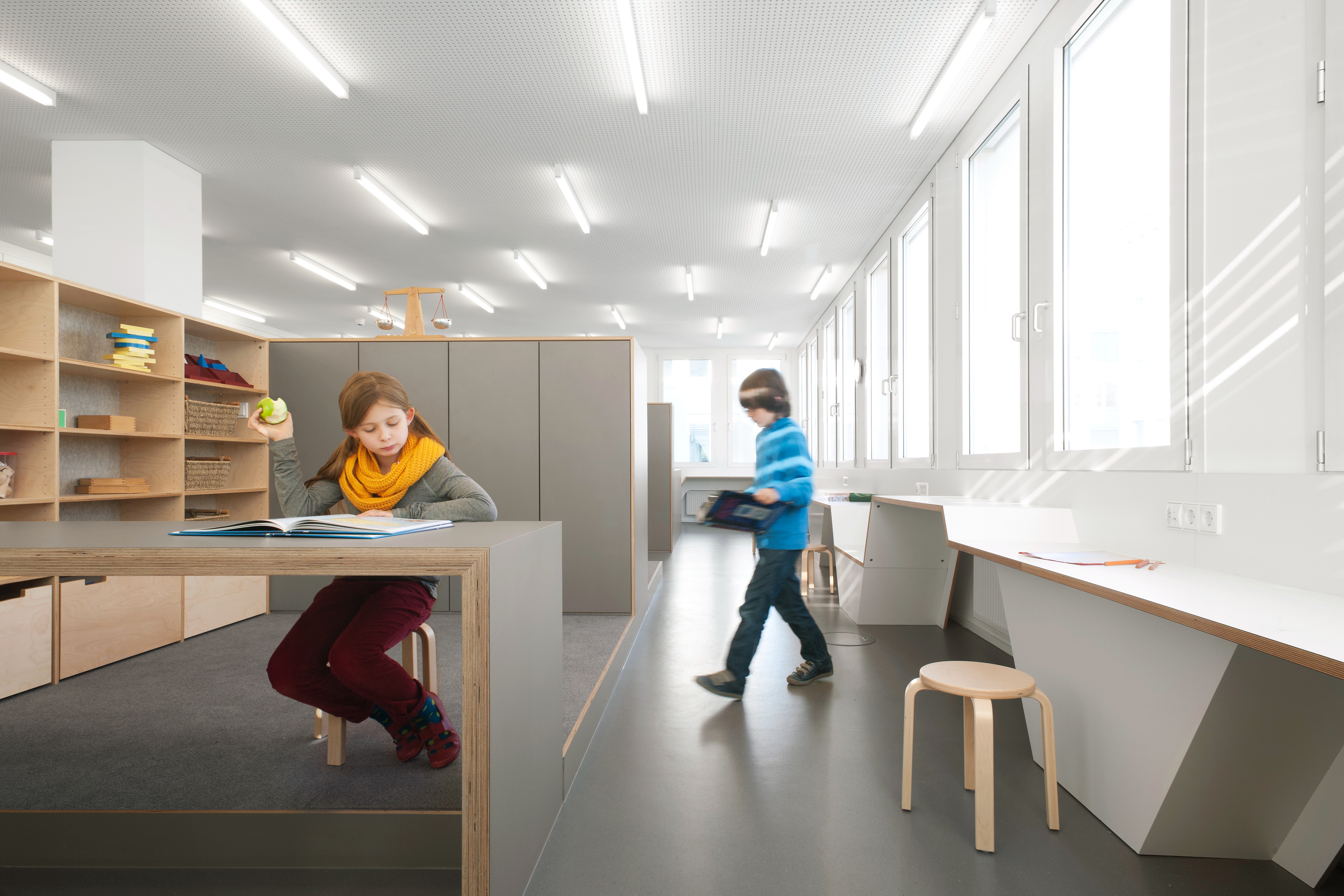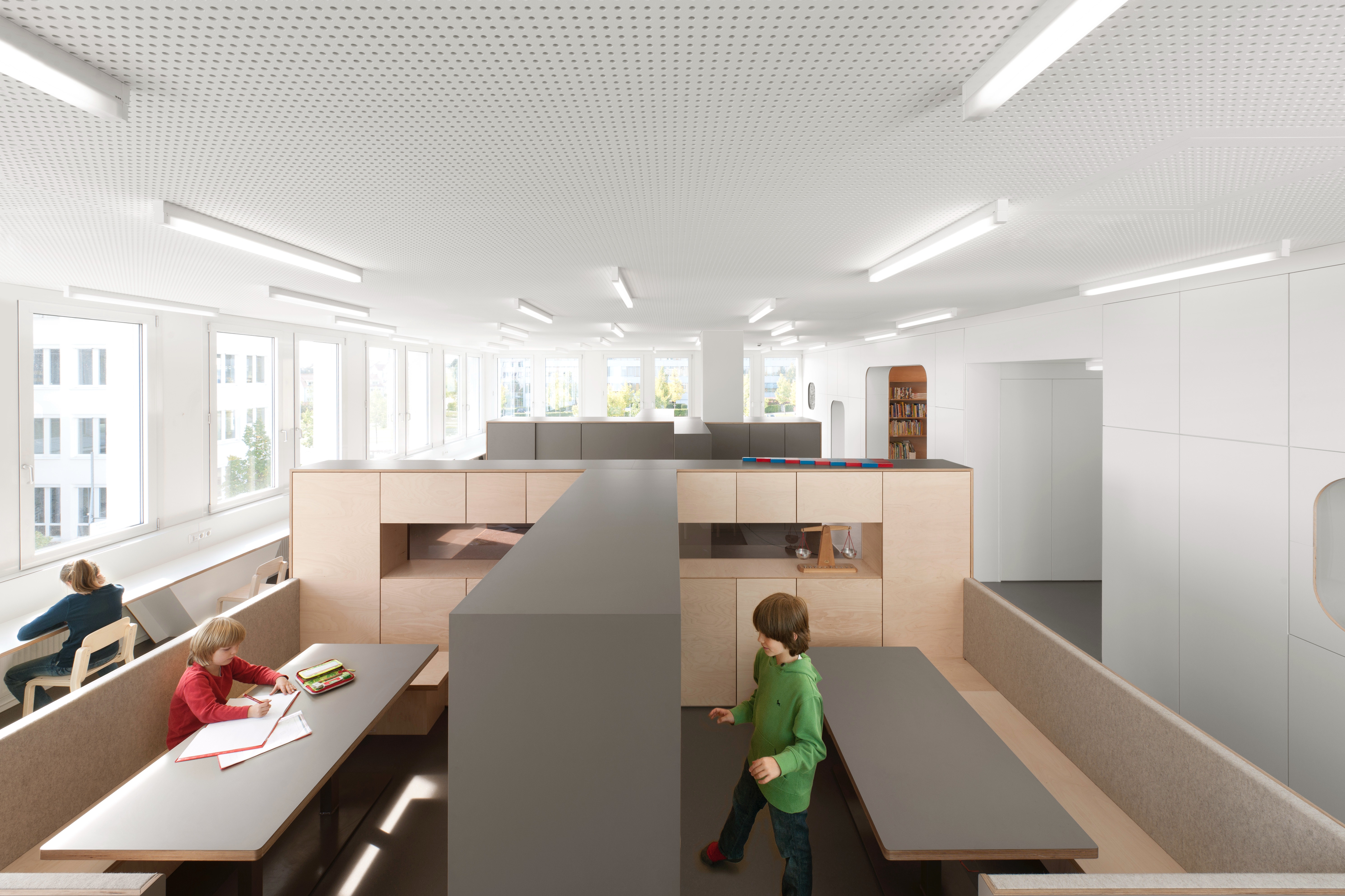 Die Rückwände der offenen Regale sind mit naturfarbenem Filz kaschiert, was einerseits optisch warm und natürlich wirkt und andererseits einen schalldämpfenden Effekt hat. Es entstehen so Bereiche, die in Relation zur Tätigkeit des Schülers, unterschiedliche Stimmungen, von eher neutral bis warm und geborgen, erzeugt.
