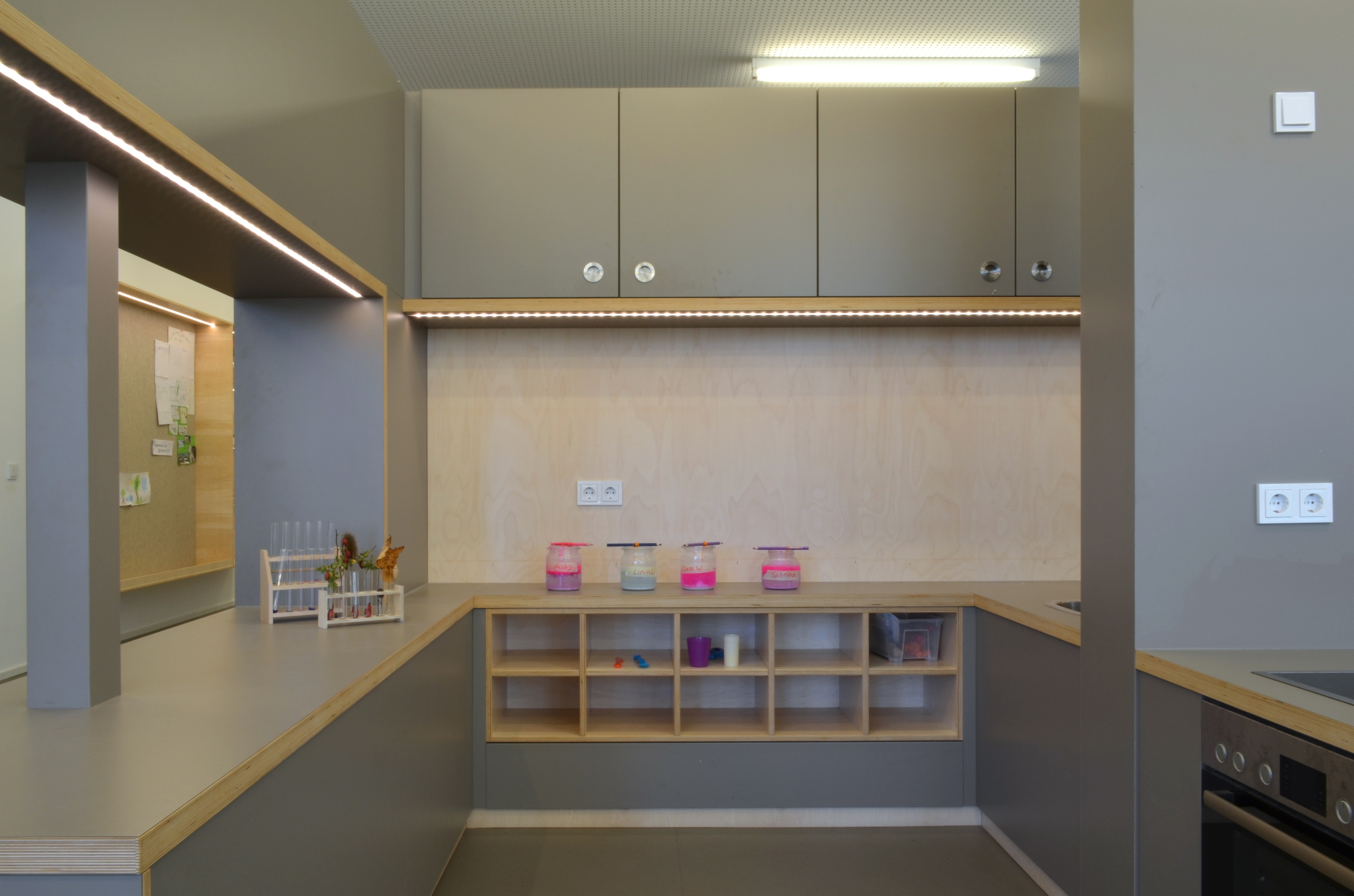 Das Raumkonzept wurde in Anlehnung an die Gestaltung der Grundschule im 2. Obergeschoss entwickelt. Der große Eingangsraum ist mit einem zentralen halbhohen Einbaumöbel, dass die Funktionen Garderobe, Küche und Labor anbietet, in Raumzonen unterteilt. Die Garderobe begrenzt den Eingangsraum, die Küche ist zum Marktplatz hin ausgerichtet.