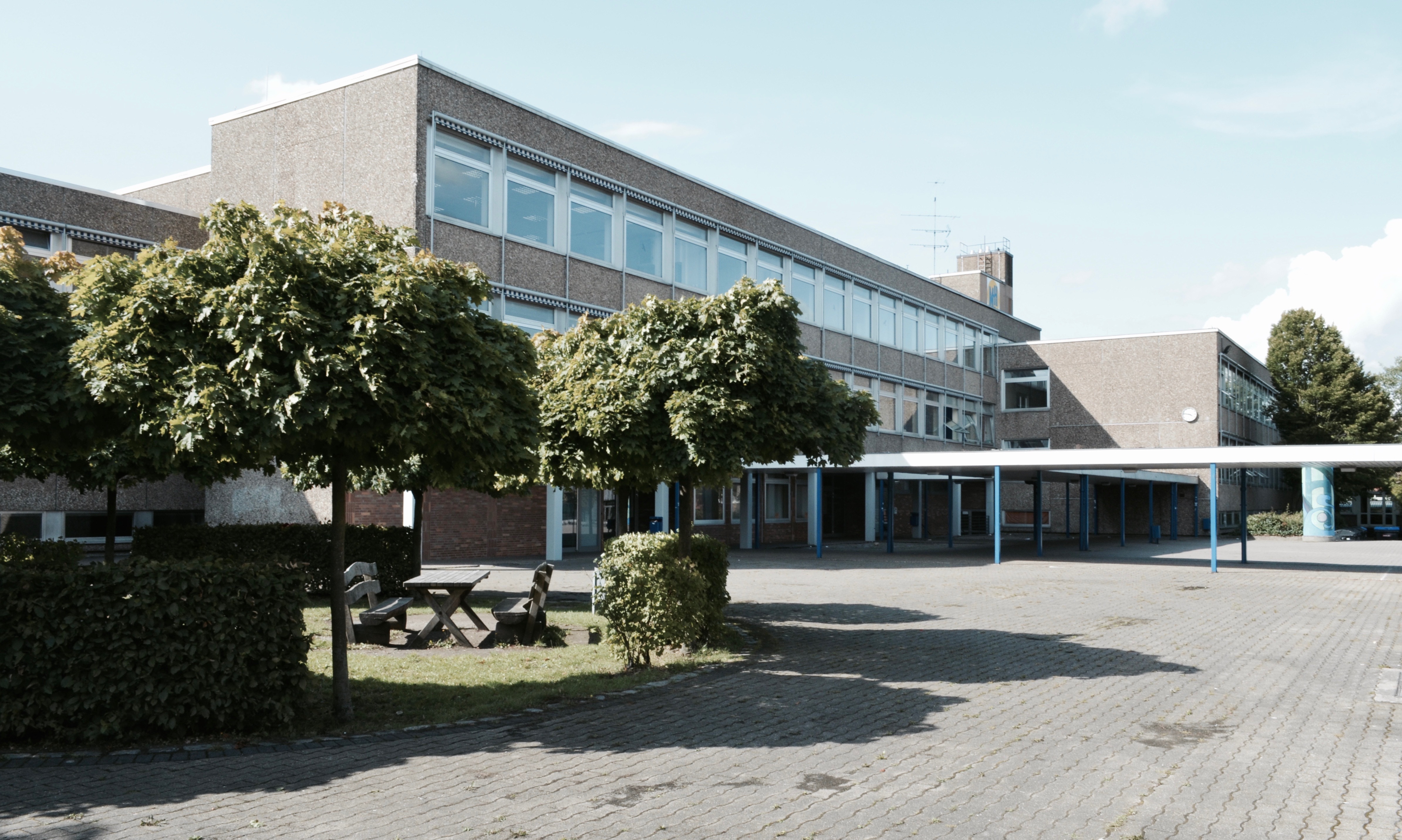 Die Waschbetonfassade des Märkischen Gymnasiums in Hamm ist sanierungsbedürftig. Die fortschreitende Korrosion der Armierung führt zu Abplatzungen, Teile der Fassade mussten bereits abge-nommen und durch Provisorien ersetzt werden.