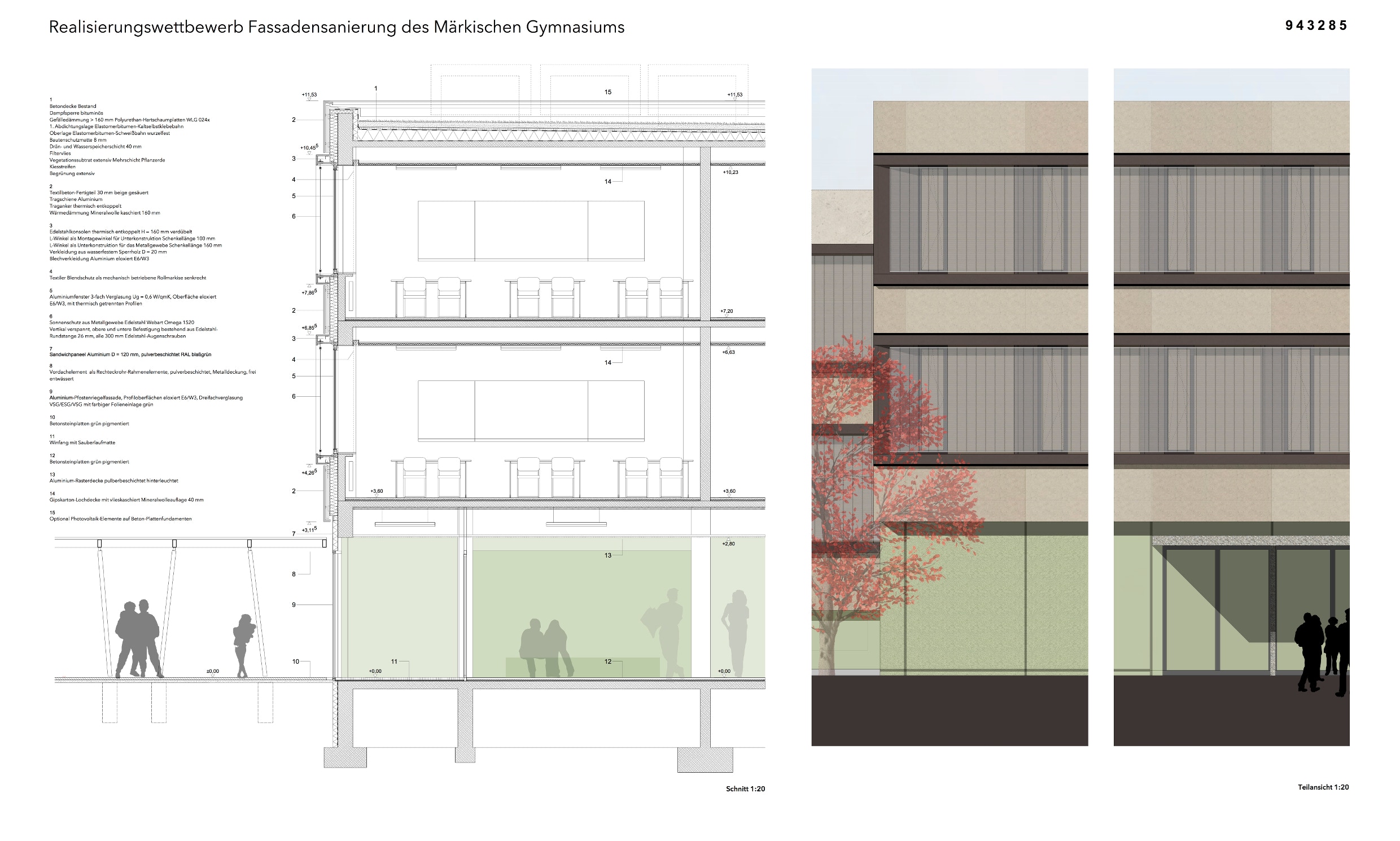Die Grundidee des Wettbewerbentwurfes ist, die spezifischen Merkmale der Bestandsfassade in das Sanierungskonzept zu übernehmen, formale und technische Unzulänglichkeiten zu beseitigen und auf ein zeitgemäßes Niveau zu heben. Dabei werden nicht nur die technischen Anforderungen seitens der Ausschreibung erfüllt, sondern auch die unklare Einbindung des Gebäudeensembles in das Umfeld behoben.