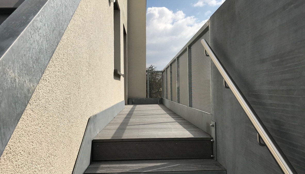 Die der Südfassade vorgelagerte Treppenanlage dient als zweiter baulicher Rettungsweg, erweitert aber auch gleichzeitig die Innenräume um weitere Balkonflächen, die geschossübergreifend in die Nutzung integriert werden können und dient zudem als Sonnenschutz. Blechpanele aus kleinmaschigem Streckmetall prägen das Erscheinbild. Je nach Blickwinkel und Sonnenstand wirkt der Baukörper mal geschlossen, mal transparent.