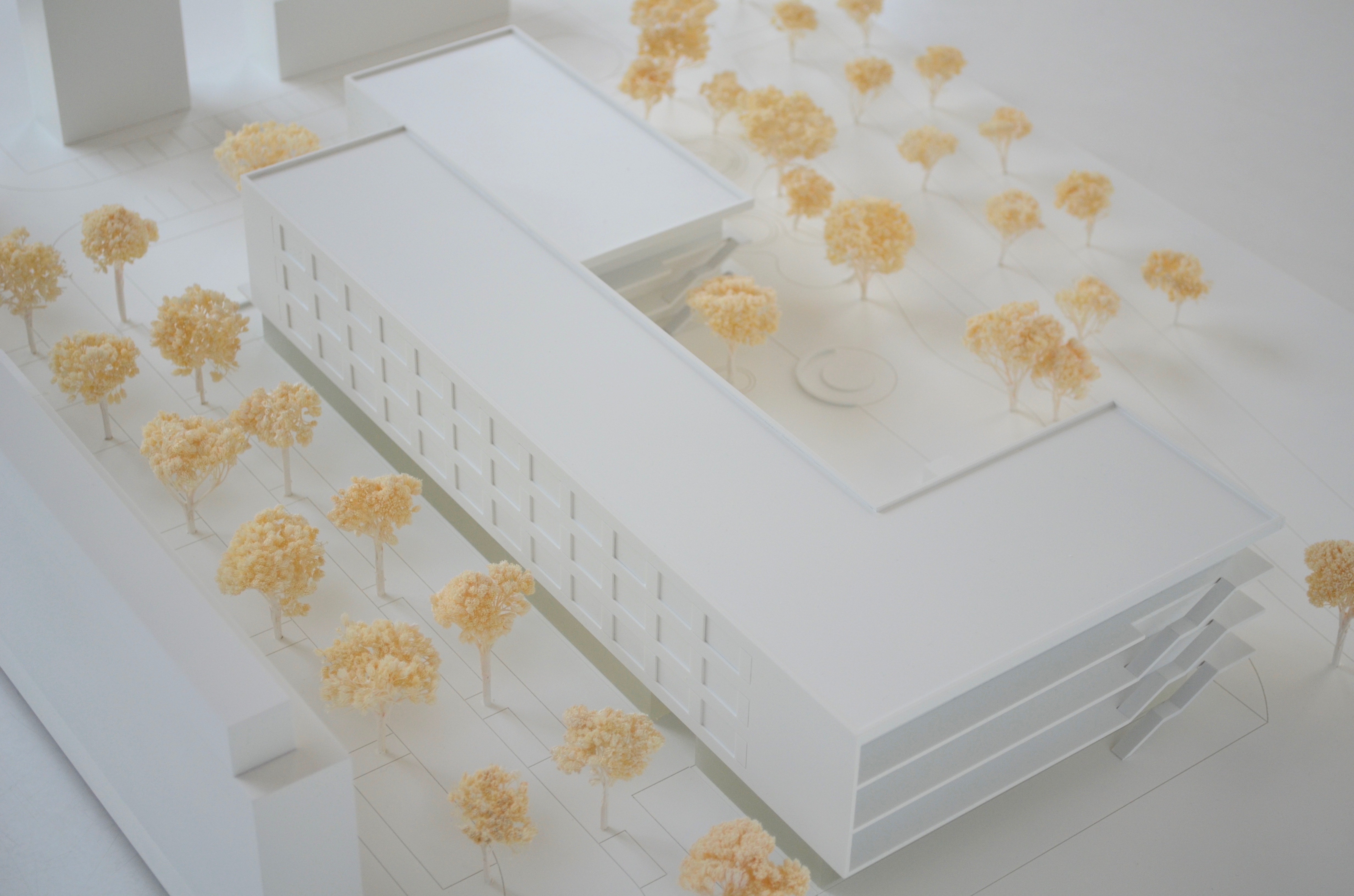 Im Winkel beider Baukörper entsteht ein Vorplatz, der Ankunftsort, Treffpunkt und Adresse für den neuen Gebäudekomplex ist. Er versteht sich als Bindeglied zwischen dem städtischen Umfeld und dem Bildungshaus, ist Wartebereich für das Abholen sowie Ort des Austausches, insbesondere für ältere Schüler. Er ist Treffpunkt und Verteiler zu den Haupteingängen der Gebäudeteile.