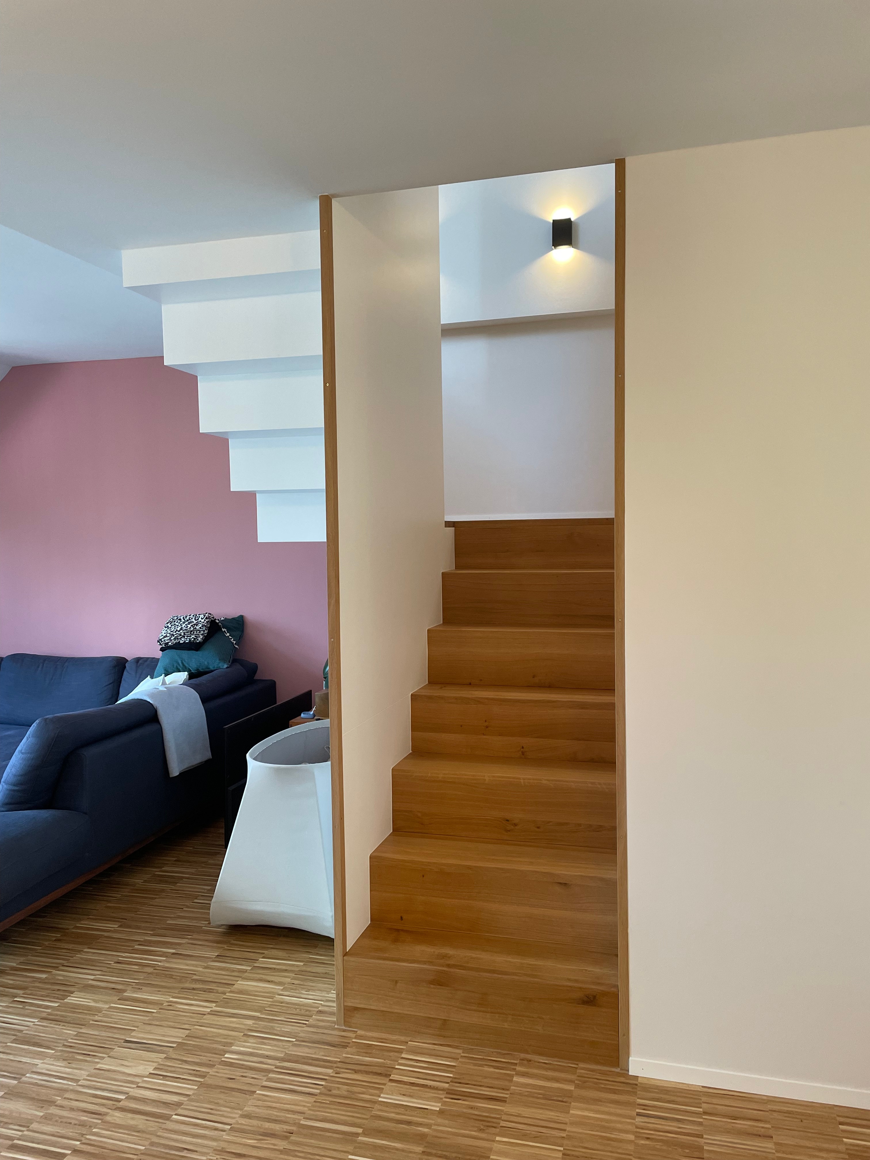 In einem Mehrparteien-Wohnhaus am Rande der Altstadt Bad-Cannstatts wurde das 1. mit dem 2. Dachgeschoss über eine interne Treppe gekoppelt und zu einer Wohneinheit ausgebaut.