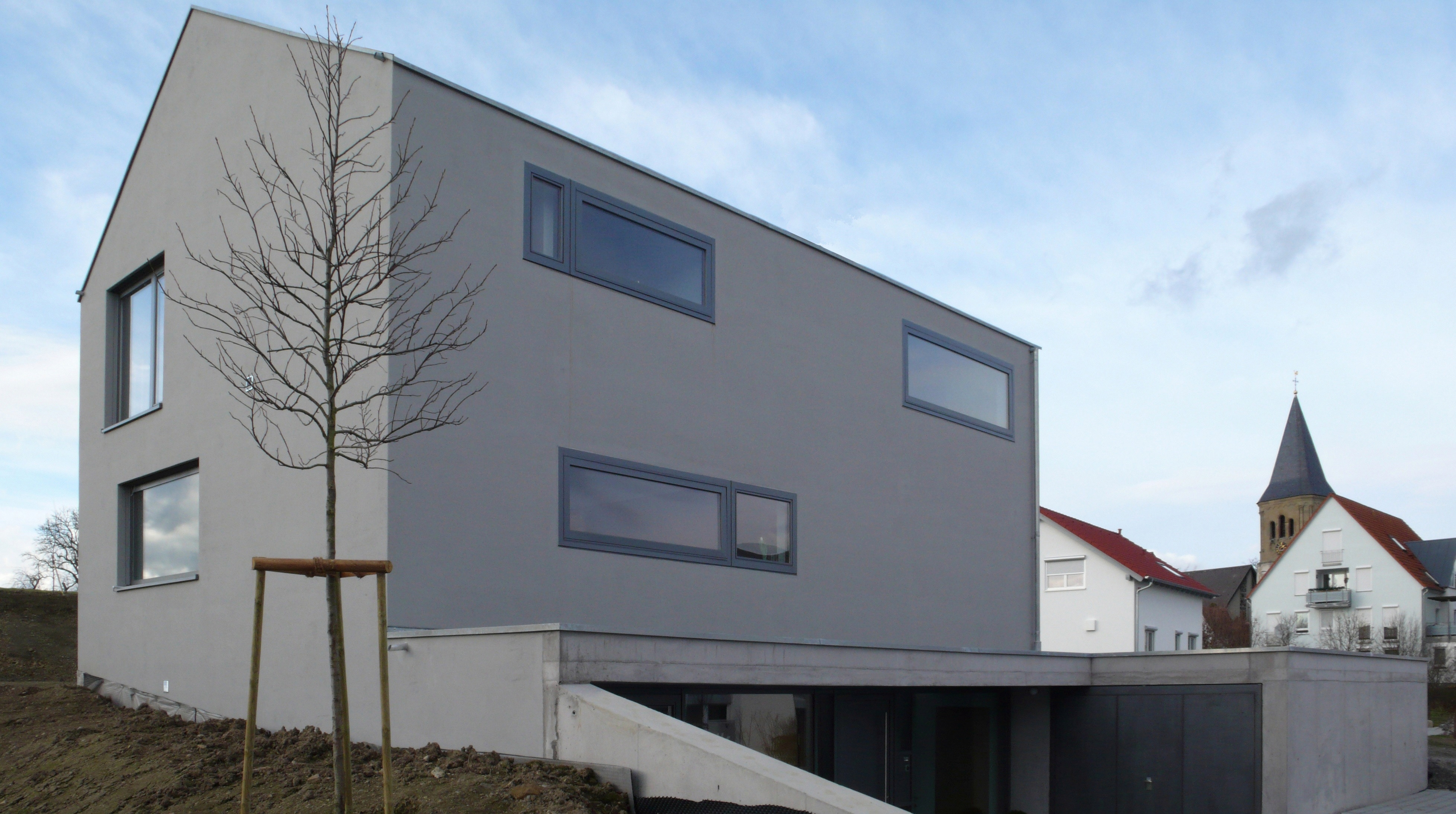 Aus einem Sockelgeschoss erhebt sich ein monolithischer, scharf geschnittener Baukörper mit einer eigenwilligen Tektur: