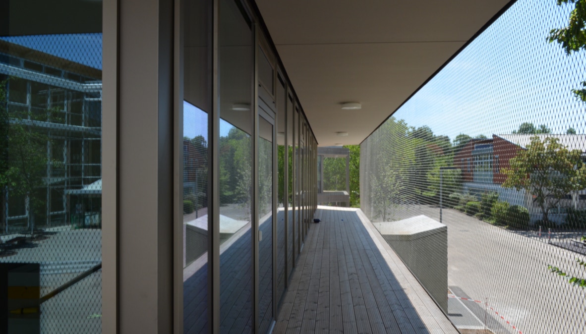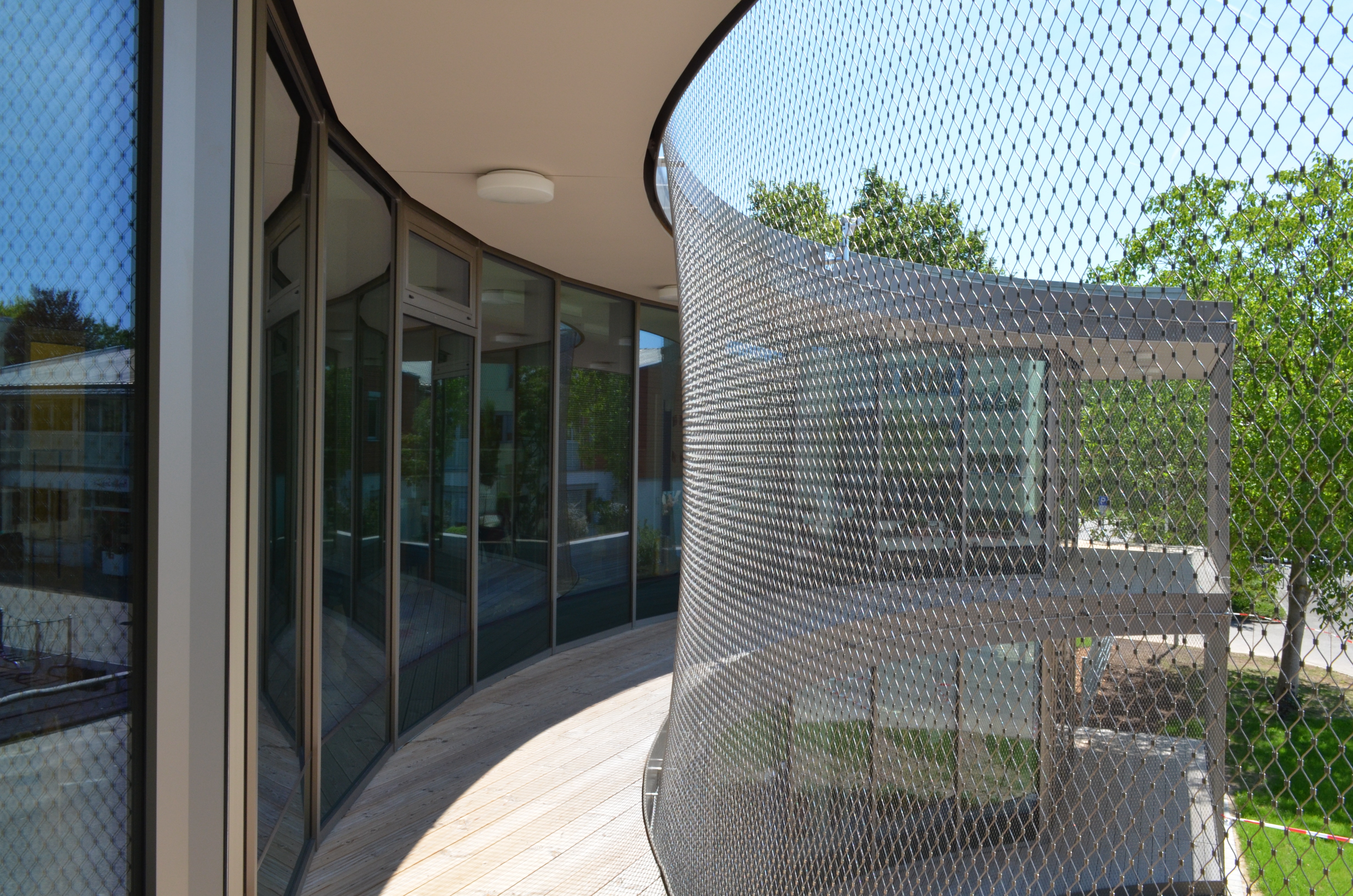 Aus dem so entwickelten klaren, scharfkantigen Baukörper mit einer dominanten Schichtung der Geschosse, wurden Kreissegmente herausgeschnitten, um den alten Baumbestand zu berücksichtigen und in das Gebäude zu integrieren. Um das gesamte Gebäude ist ein Netz aus Edelstahl geschlungen. Dies dient bei freiem Ausblick (auch für Kinder) der Absturzsicherung. Das Netz wurde begrünt und schützt so den Innenraum zusätzlich vor Sonneneinstrahlung.