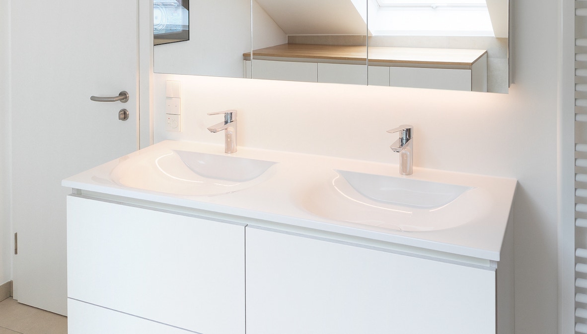 Konstruktion: Möblierung Multiplex weiss beschichtet, Eichenholz massiv, Parkett, Fussbodenheizung
