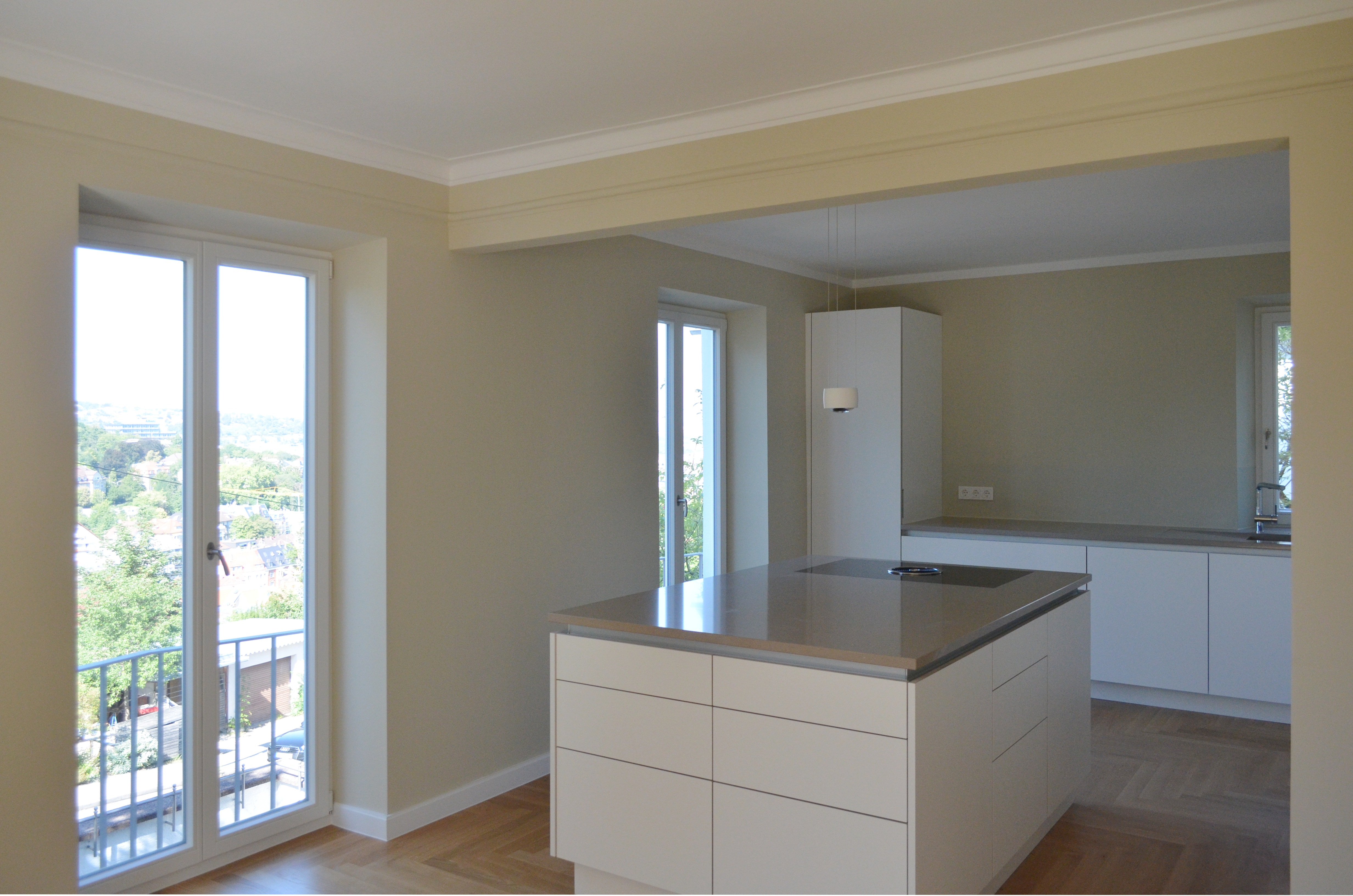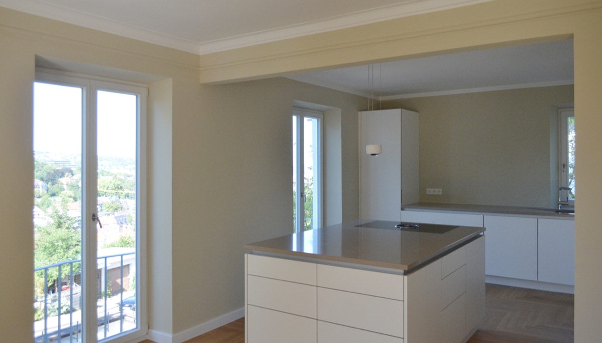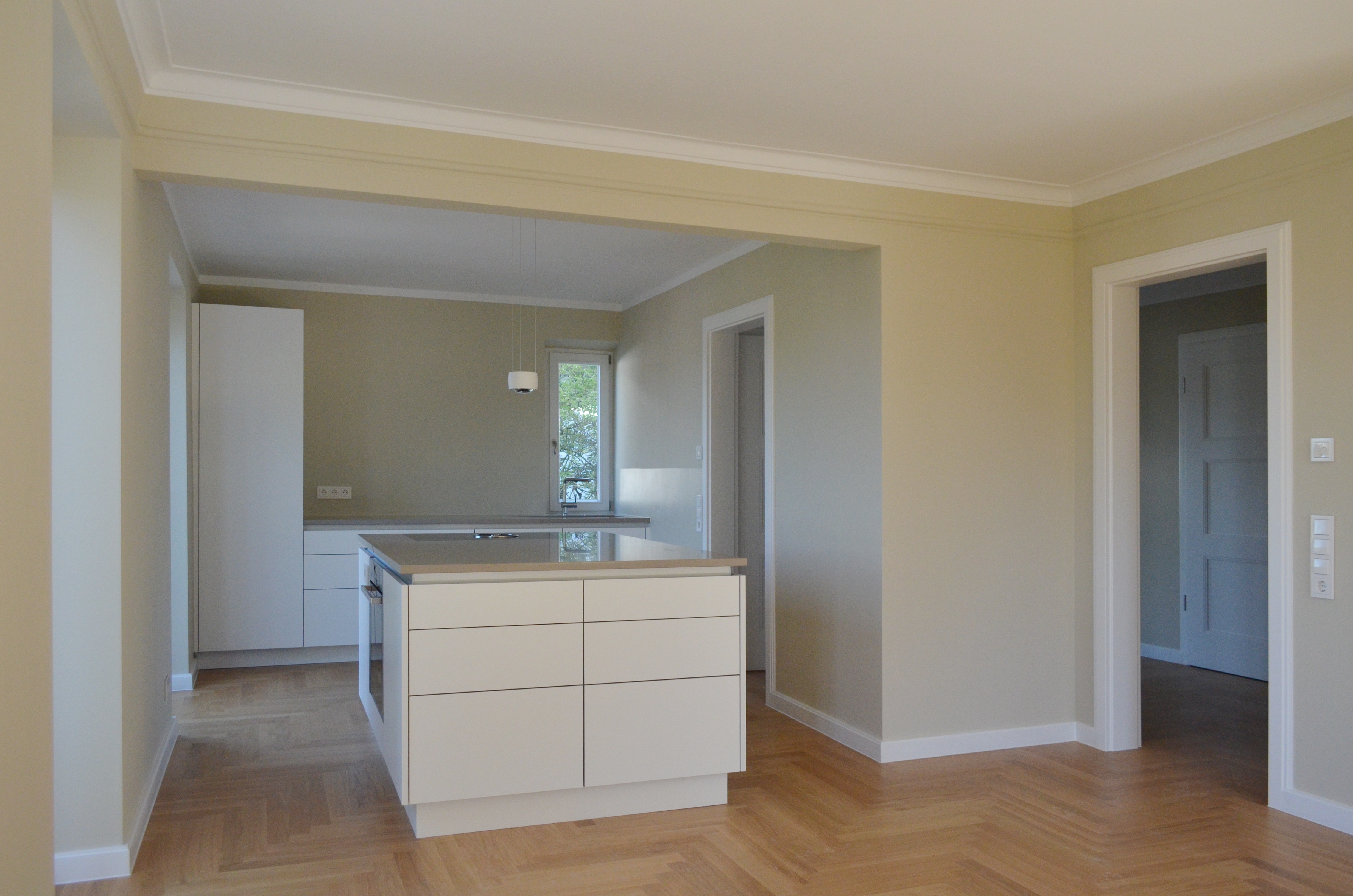 In diesem Mehrfamilienhaus aus den 30 Jahren wurde die Wohnung im Gartengeschoss kernsaniert. Die Raumzuschnitte wurden hierbei kaum verändert, lediglich die Küche mit dem Wohnraum verbunden. Eine zusätzliche Fensteröffnung auf der Strassenseite öffnet den Blick über die Stadt. Eingriffe aus den 60er Jahren konnten rückgebaut und die ursprüngliche Fassadengliederung wiederhergestellt werden.